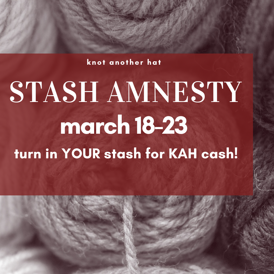 *The inevitable fine print: only full skeins with intact ball bands will be accepted; minimum contribution is 16oz; KAH Cash not redeemable on sale yarn, classes, or events; KAH Cash must be redeemed by 12/31/26. Non-locals may ship us their stash the week of March 16th and we will provide a KAH Stash Cash equivalent coupon code for use on our website.