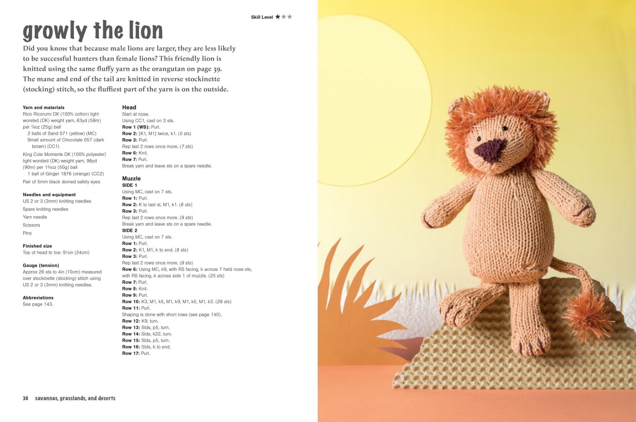 Create animals of the savanna including a fearsome lion, a super-cute hippo, and a striking zebra. Explore the forest as you stitch a tiger, an orangutan, and a chameleon in multicolored yarn.